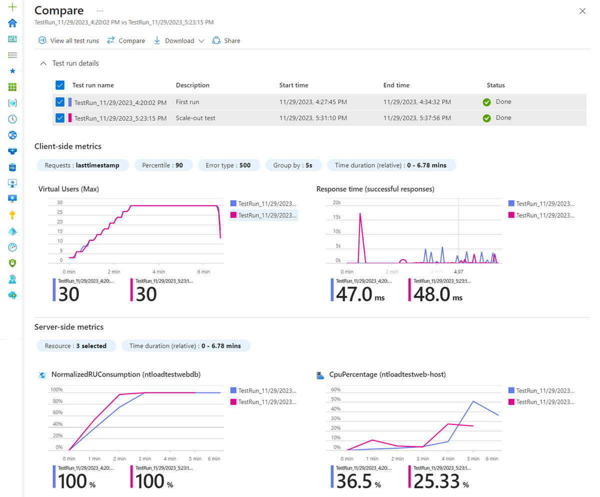 To compare test runs in Azure Load Testing, you first have to select up to ten runs within a load test. You can only compare runs that belong to the same load test. After you select the test runs you want to compare, you can visually compare the client-side and server-side metrics for each test run in the load test dashboard.
