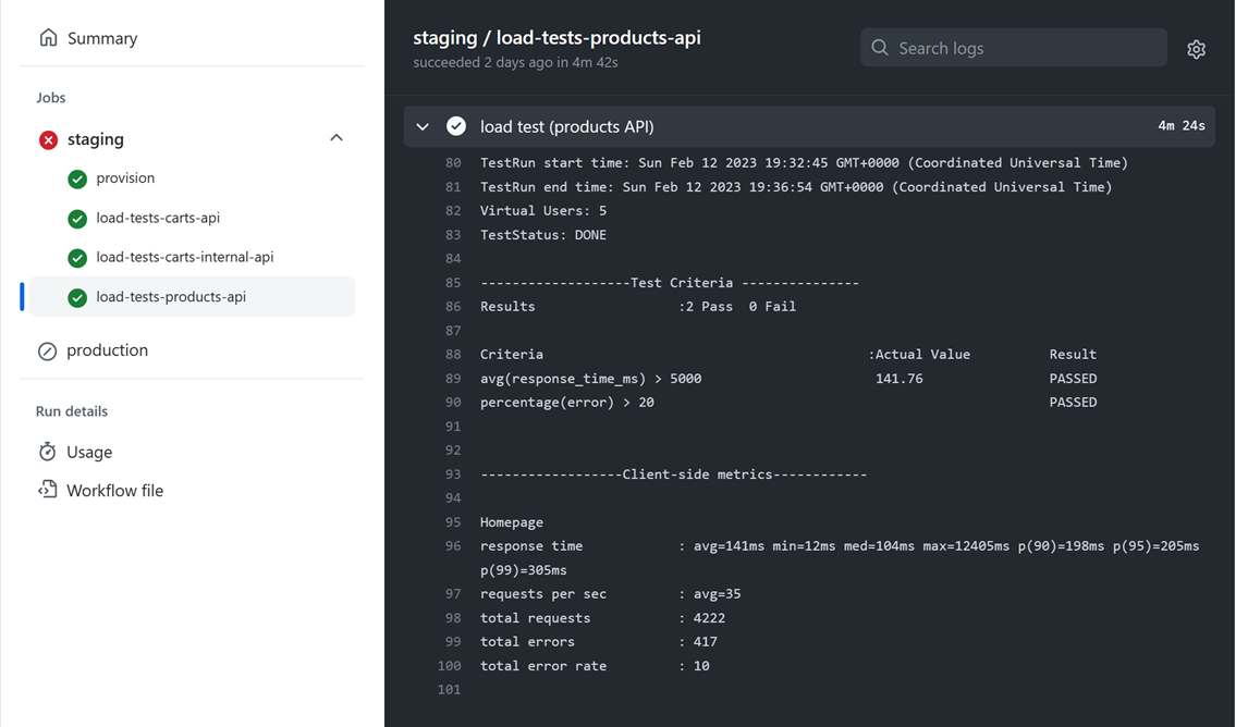 A load test might run the test script until the end (test status equals Done), but might not pass all the test fail criteria. If at least one of the test criteria didn't pass, the test result of the test run is set to Failed.