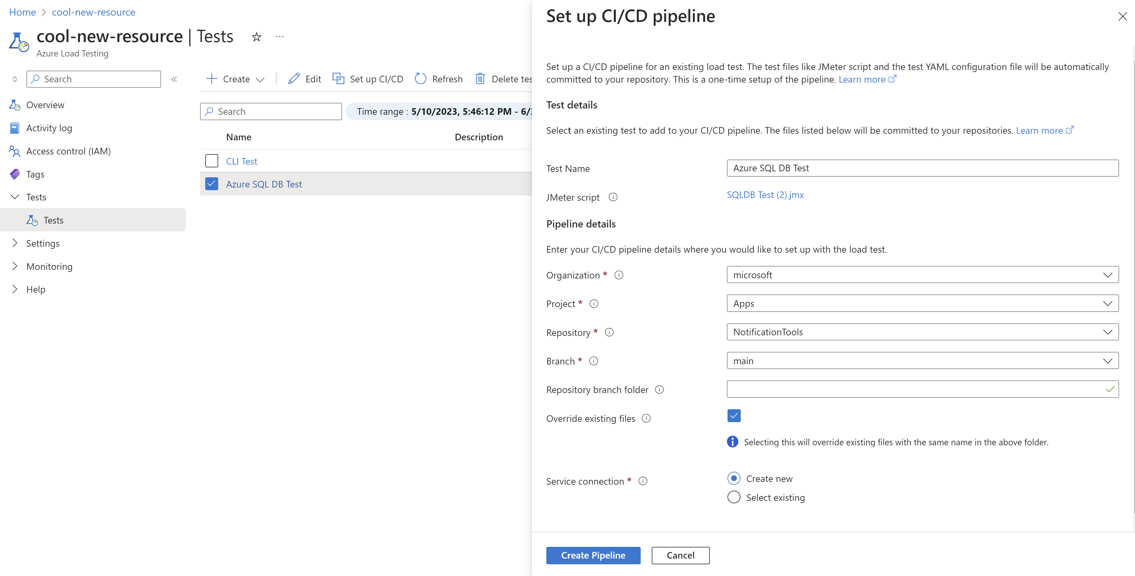 Service connection Select Create new to create a new service connection to allow Azure Pipelines to connect to the load testing resource.