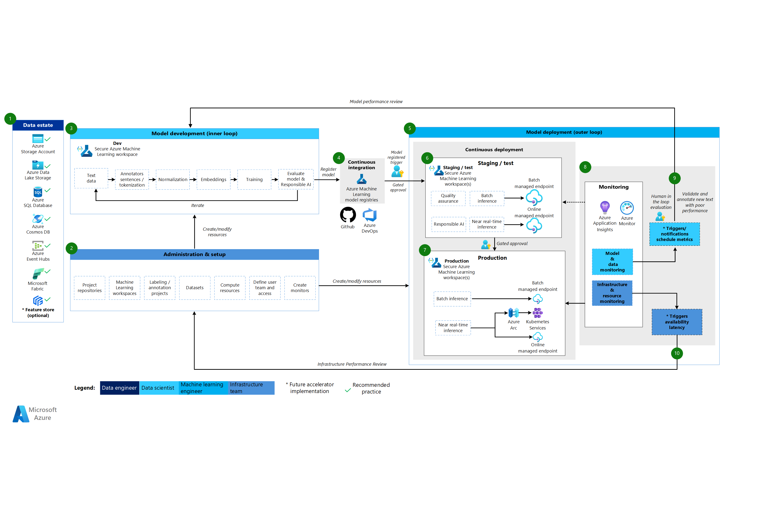After a model passes the staging and test phase, machine learning engineers can use human-in-the-loop gated approval to promote it to production. Model deployment options include a managed batch endpoint for batch scenarios or either a managed online endpoint or Kubernetes deployment that uses Azure Arc for online, near real-time scenarios. Production typically takes place in one or more dedicated and secure Machine Learning workspaces.