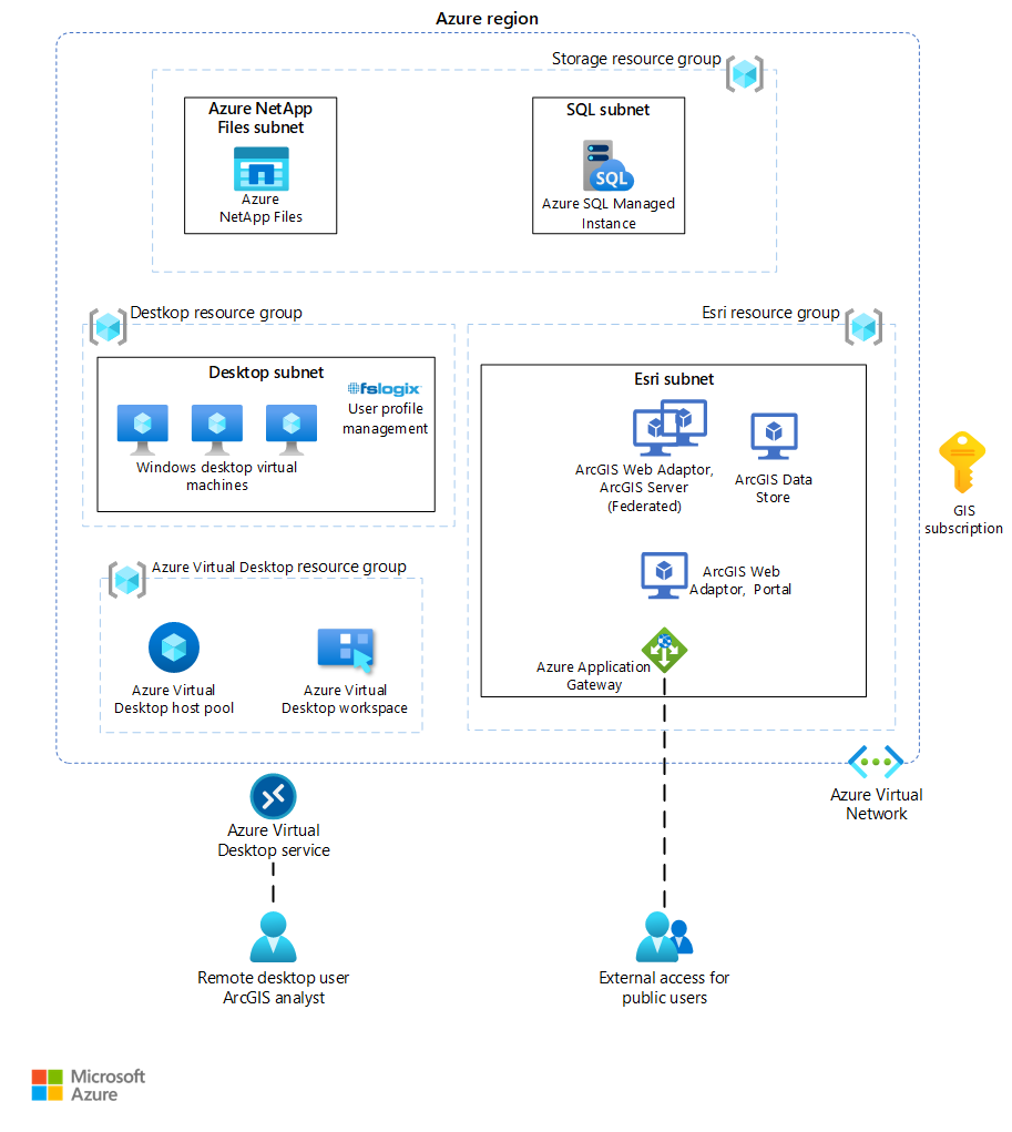 This architecture shows how you can deploy Esri ArcGIS Pro in Azure Virtual Desktop to support the hyperscale of Azure. The architecture also includes back-end components like ArcGIS Enterprise to build a complete system on Azure.