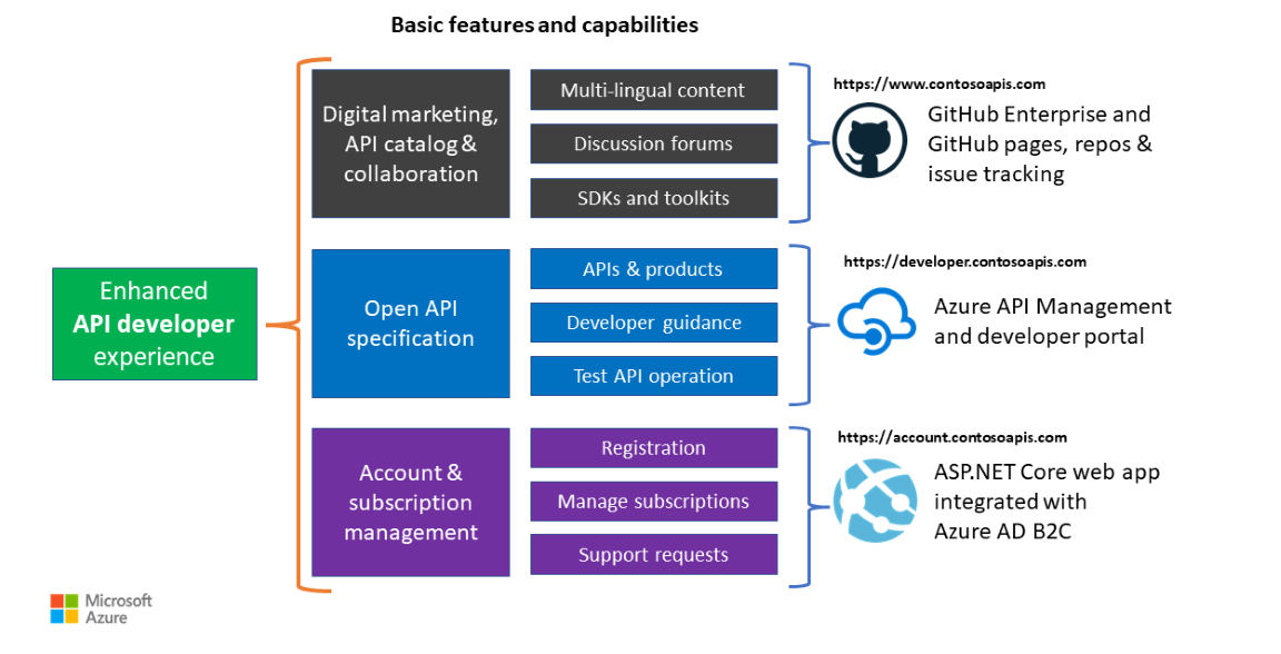 As the publisher of APIs, you need a website that effectively markets your APIs and helps customers to differentiate between offerings. When they've selected APIs, you need to be able to give access only to authenticated users, manage consumption, and deliver accurate invoices for use. This example scenario shows how you can use Azure service and GitHub to create a platform that does all of this and more.