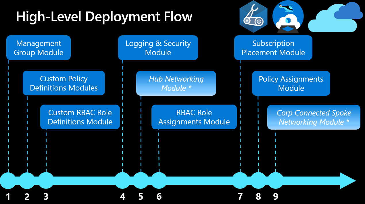 | Core | Built-In and Custom Policy Assignments | This module deploys the default Azure landing zone Azure Policy assignments to management groups. It also creates role assignments for system-assigned Managed Identities created by policies. | |