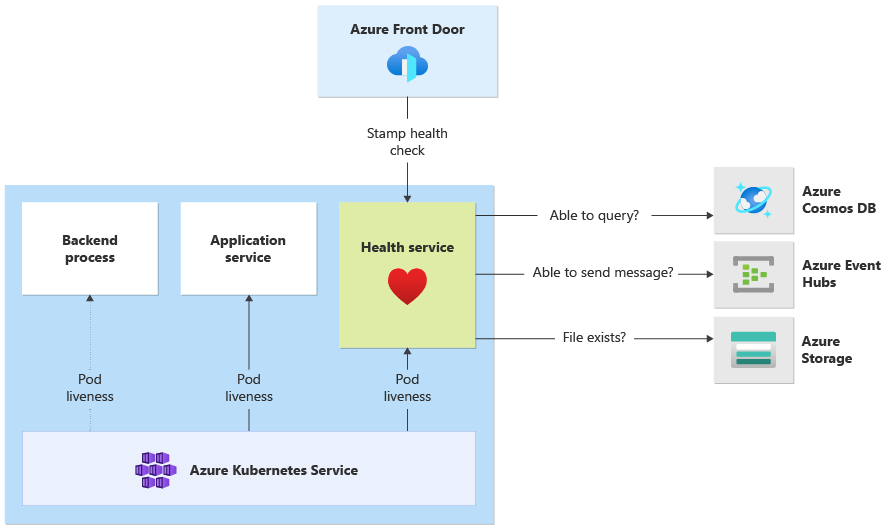 Health Service doesn't respond if the AKS cluster is down, which renders the workload unhealthy. When the service runs, it performs periodic checks against critical components of the solution. All checks are done asynchronously and in parallel. If any of the checks fail, the whole stamp is unavailable.