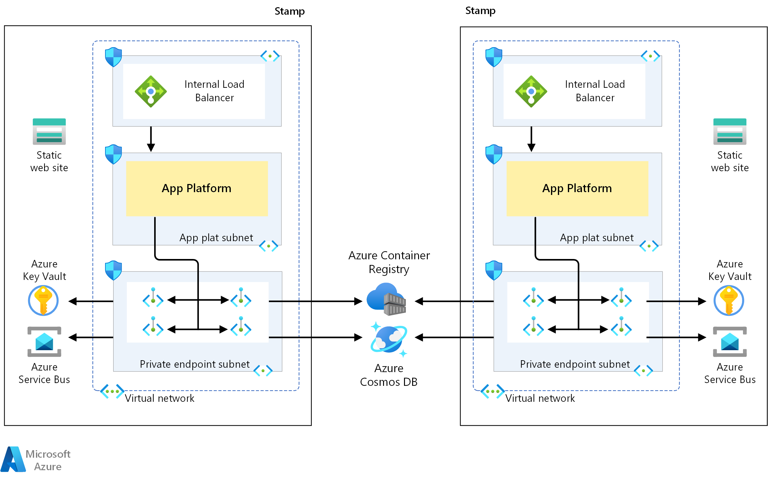 Private endpoints are supported for all Azure PaaS services recommended for mission-critical workloads. With private endpoints configured for the application platform, all communication would travel through the virtual network of the stamp.
