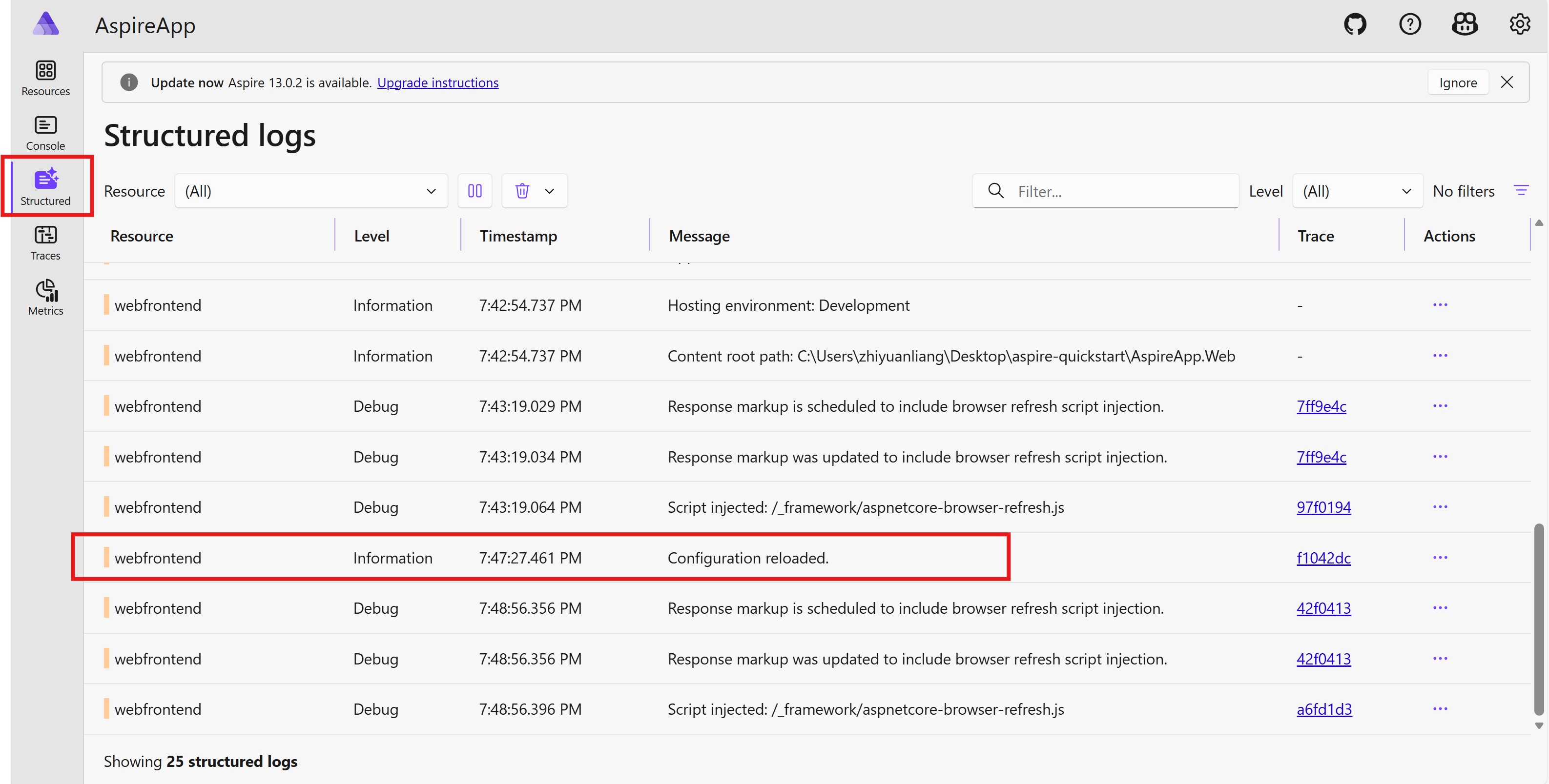 4. Go to the Aspire dashboard and open the structured logs. You see that the webfrontend resource has a log with message "Configuration reloaded.".