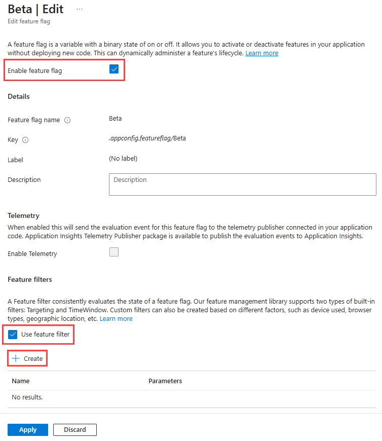 In the Edit feature flag dialog, select Enable feature flag if it isn't already selected. Select Use feature filter, and then select Create.