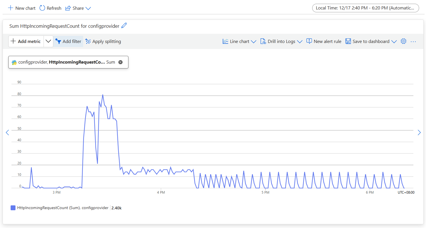 Select the Metric name and the Aggregation type. The following screenshot shows a Sum of HTTP Incoming Request Count for an App Configuration store.