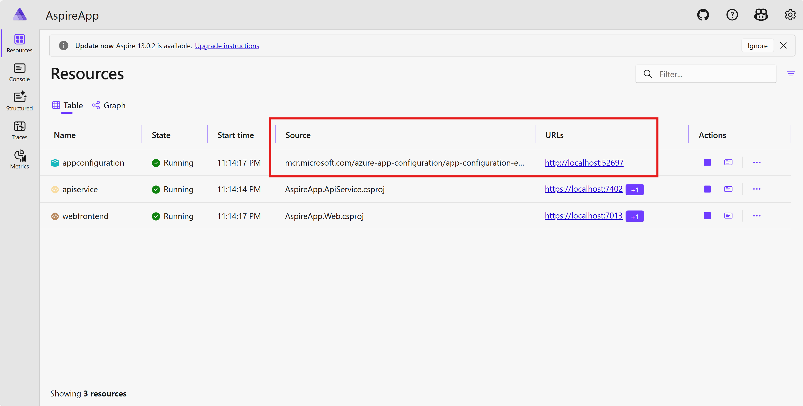 6. Run the AppHost project. Go to the Aspire dashboard. You see the App Configuration emulator resource is running.