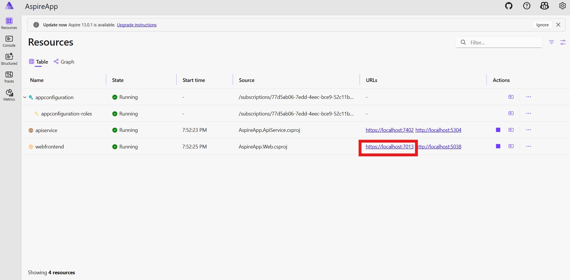 4. Restart the AppHost project. Go to the Aspire dashboard and click the URL of the web frontend.