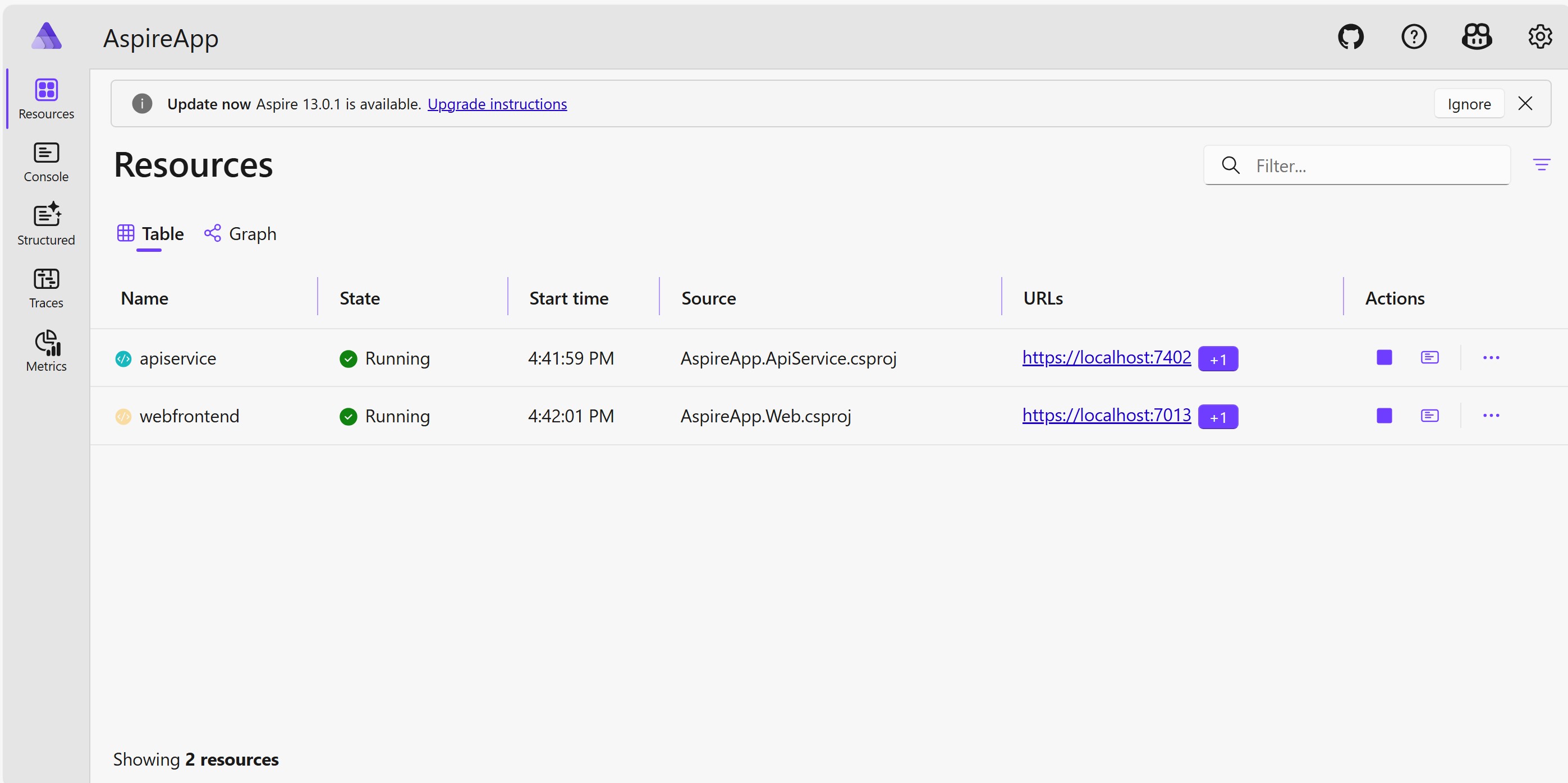 1. Run the AppHost project. You see the Aspire dashboard in your browser.