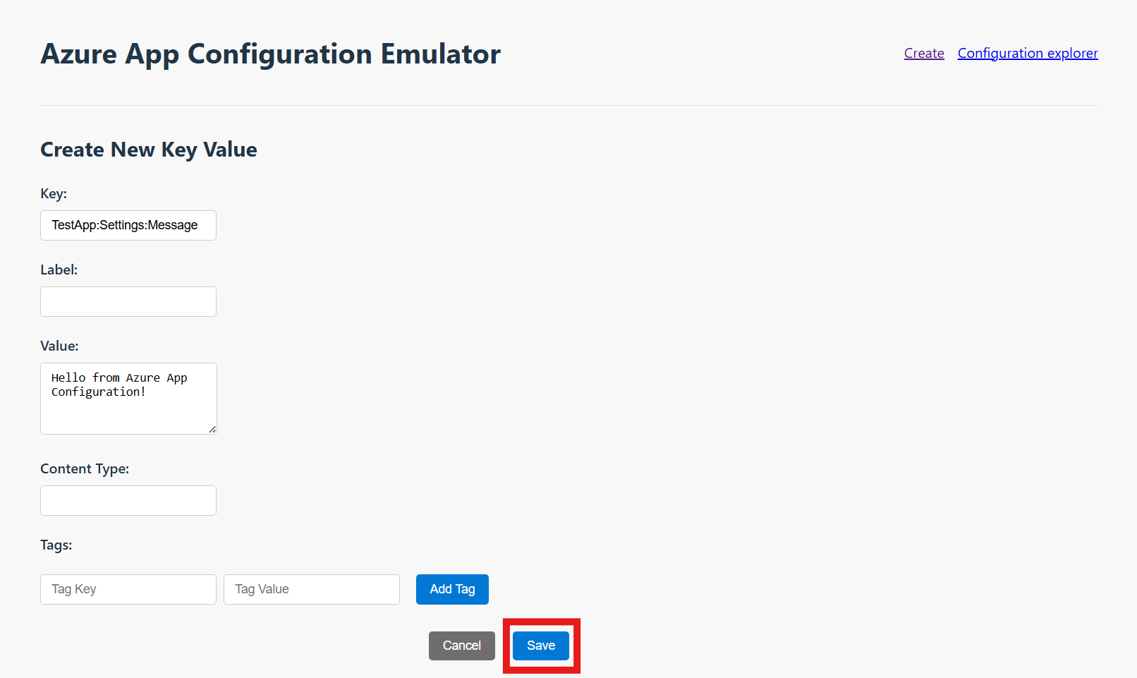 Screenshot of the App Configuration emulator UI of creating a new key value.