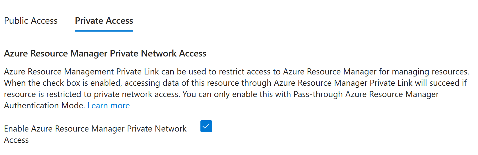Go to the Private Access tab, and then select Enable Azure Resource Manager Private Network Access.