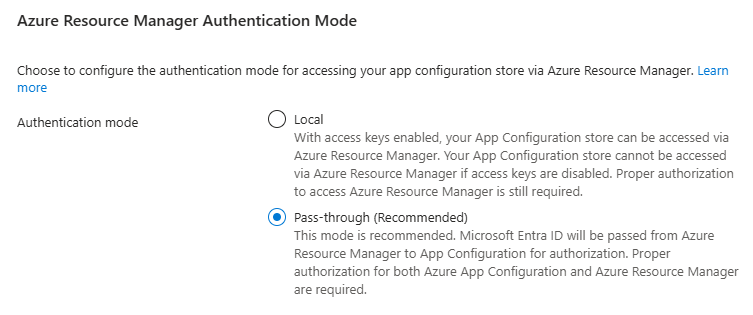 - In your App Configuration resource, set the Azure Resource Manager authentication mode to Pass-through.
