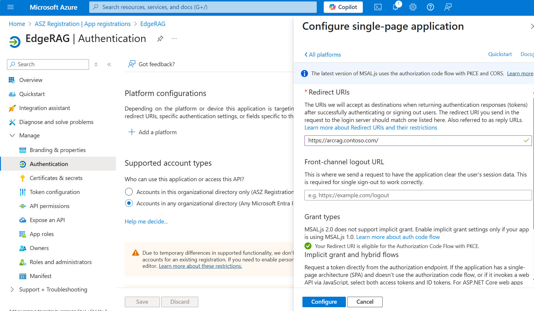 https://arcrag.contoso.com/) as the Redirect URIs.Select Configure.