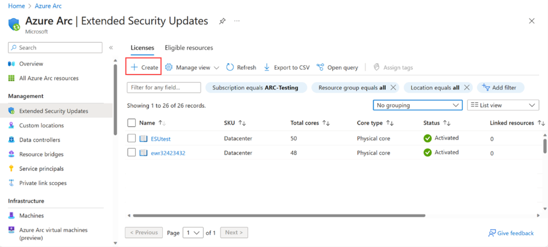 On the Azure Arc page, select Extended Security Updates in the left pane. From here, you can view and create ESU Licenses and view Eligible resources for ESUs.