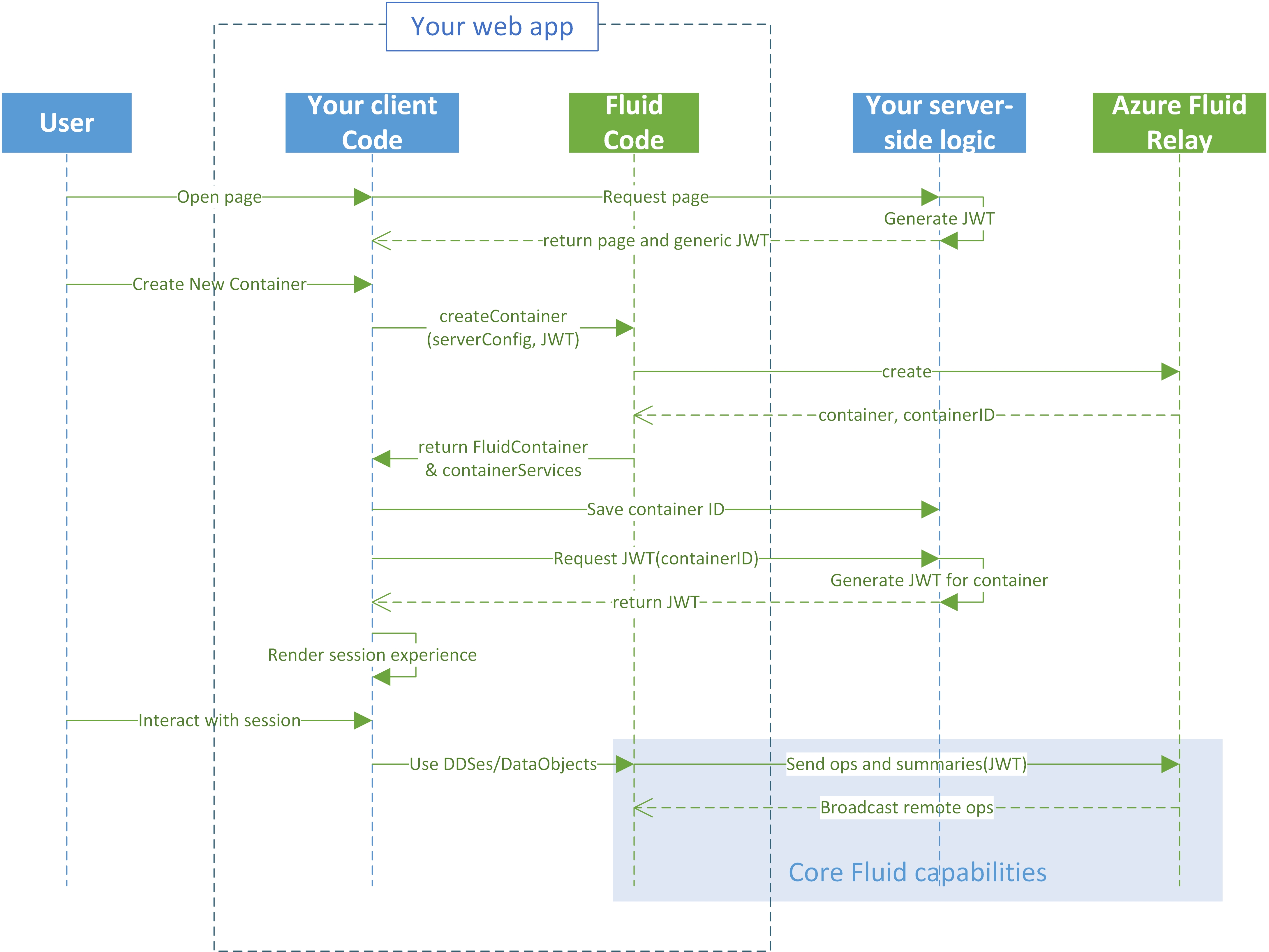 Before interacting with the container, the client will request a container-specific JWT that will be used for subsequent calls from the Fluid Framework runtime to the Azure Fluid Relay service.