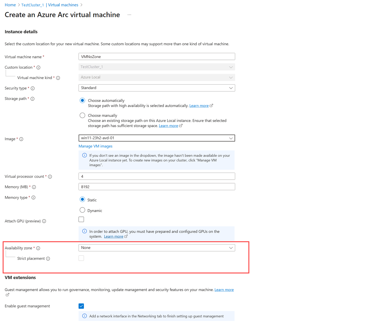 You can now create the Azure Local VM in a specific availability zone with or without strict placement.