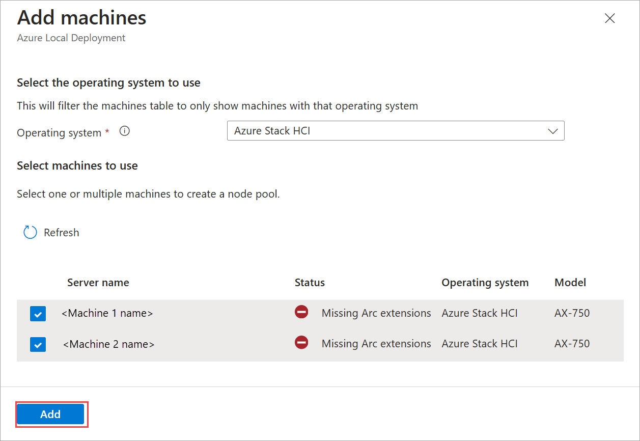 - Select one or more machines that make up this Azure Local instance. These machines could show as Ready or as Missing Arc extensions.