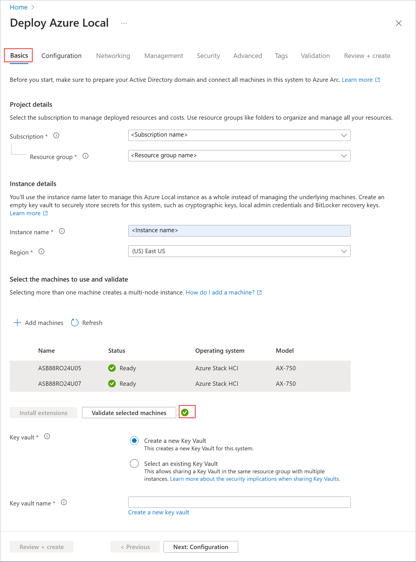 Select an existing Key Vault or select Create a new Key Vault. Create an empty key vault to securely store secrets for this system, such as cryptographic keys, local admin credentials, and BitLocker recovery keys.