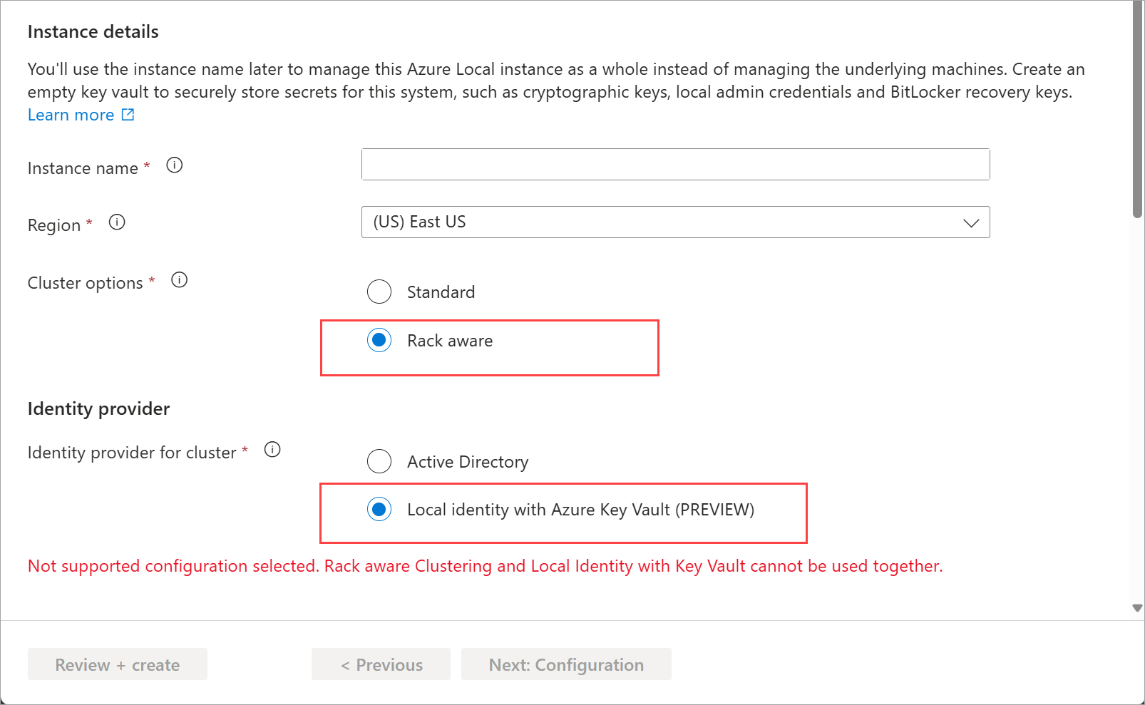 If you select Rack aware cluster and Local identity with Azure Key Vault together, you see an error to the effect that the combination is not supported.