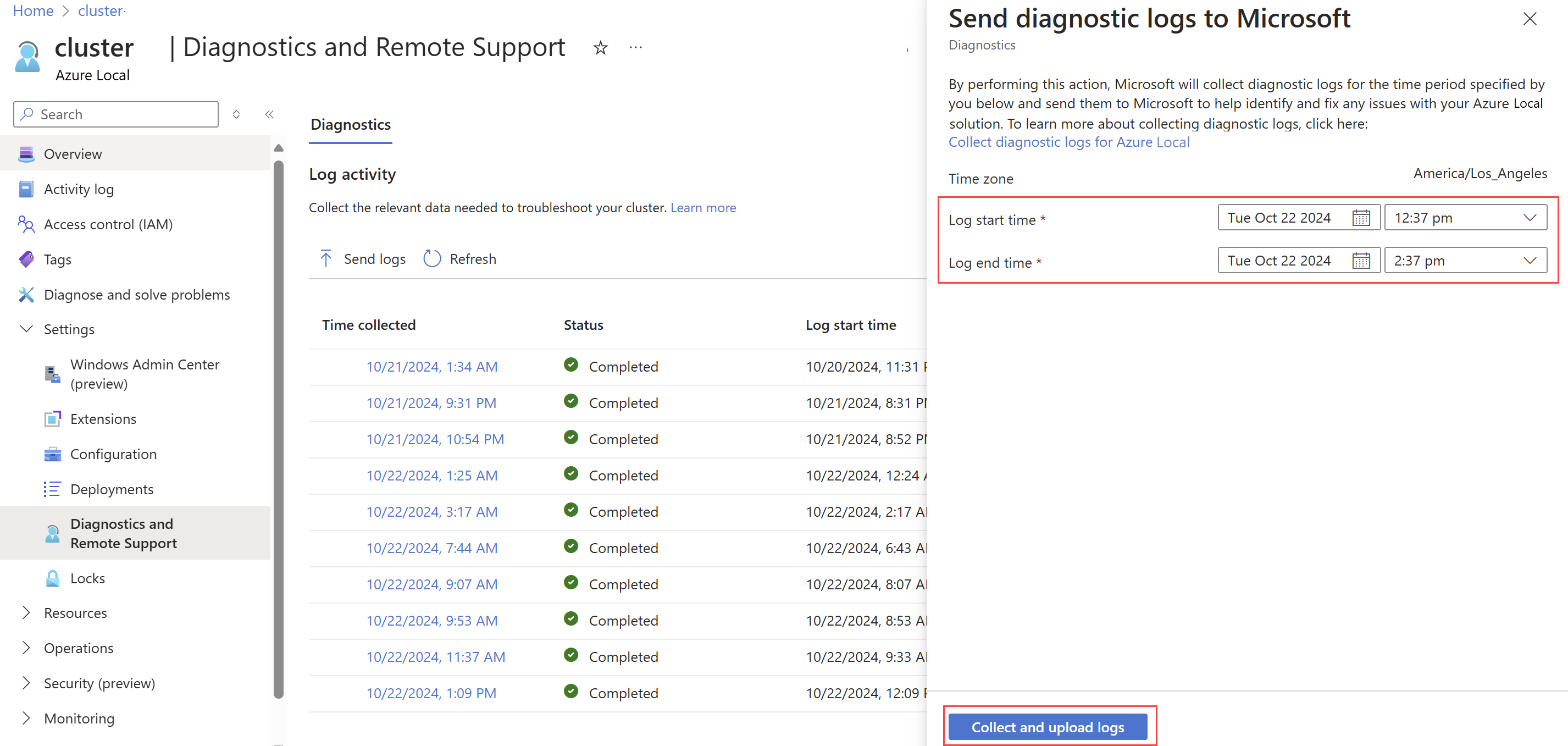 To use PowerShell for log collection, run the Send-DiagnosticData cmdlet from any node within the Azure Local instance. This cmdlet temporarily copies the logs locally. The copied logs are parsed, sent to Microsoft, and then deleted from your system.