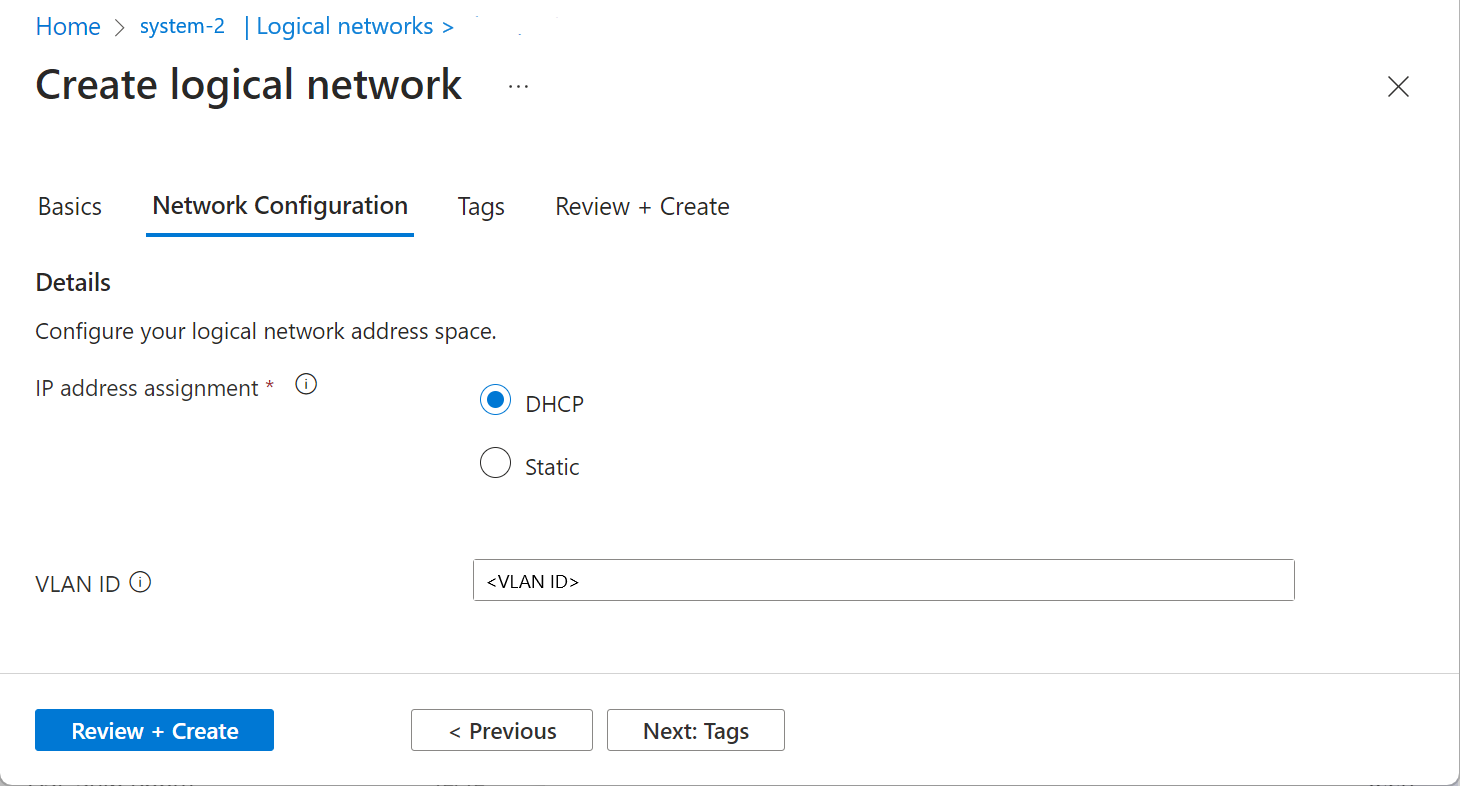 Note: Outbound traffic from the VM, such as internet-bound packets, may be dropped if a default VLAN isn’t configured on the physical switch to handle untagged traffic.ip-allocation-method IP address allocation method and could be DynamicorStatic. If this parameter isn't specified, by default the logical network is created with a dynamic configuration.address-prefixes Subnet address in CIDR notation. For example: "192.168.0.0/16". dns-servers List of IPv4 addresses of DNS servers. Specify multiple DNS servers in a space separated format. For example: "10.0.0.5" "10.0.0.10" gateway Ipv4 address of the default gateway. Note