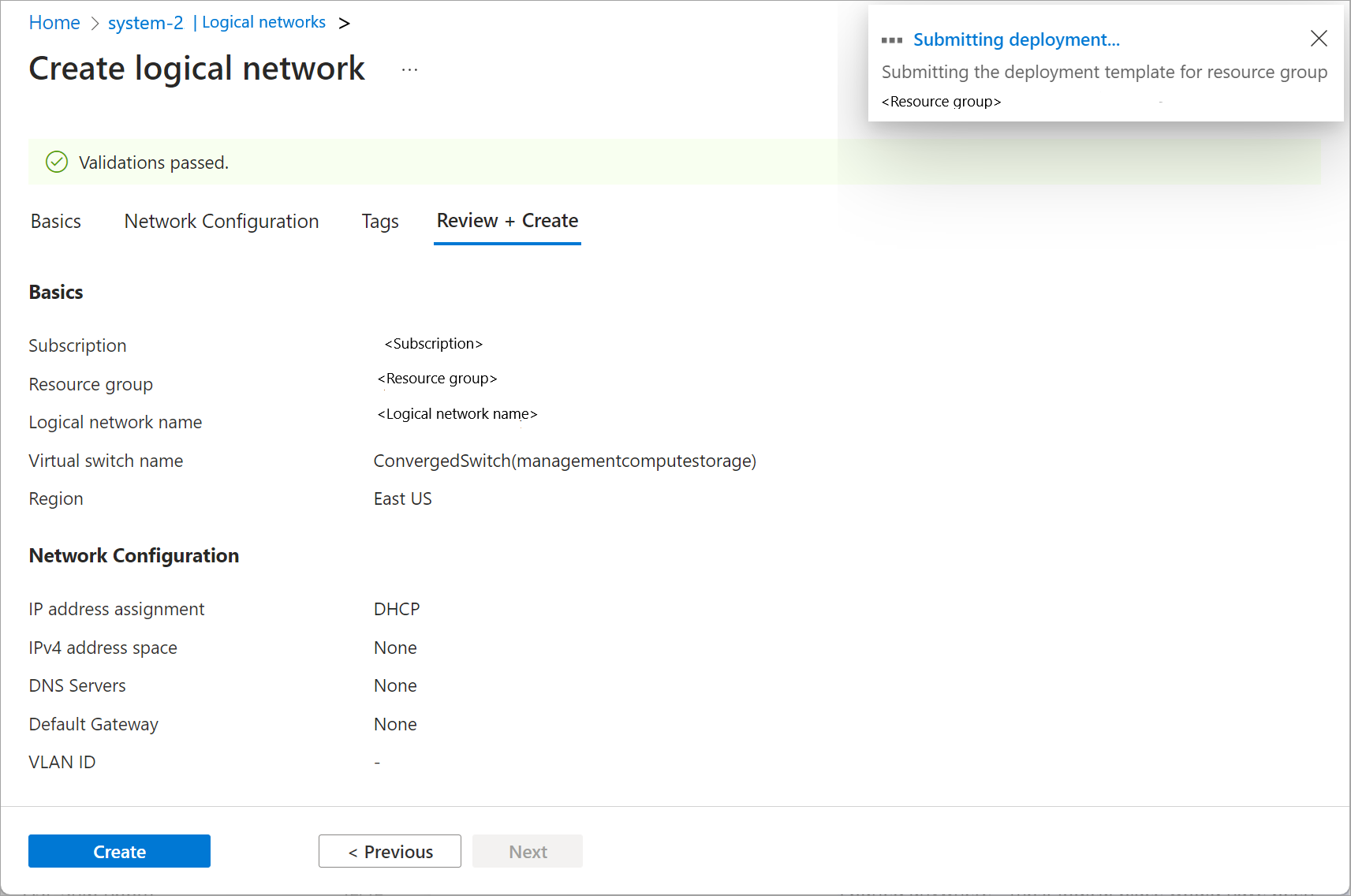 Parameters Description name Name for the logical network that you create for your Azure Local. Make sure to provide a name that follows the Rules for Azure resources. You can't rename a logical network after it's created. vm-switch-name Name of the external virtual switch on your Azure Local where you deploy the logical network. resource-group Name of the resource group where you create the logical network. For ease of management, we recommend that you use the same resource group as your Azure Local. subscription Name or ID of the subscription where Azure Local is deployed. This could be another subscription you use for logical network on your Azure Local. custom-location Use this to provide the custom location associated with your Azure Local where you're creating this logical network. location Azure regions as specified by az locations.vlan VLAN identifier for Azure Local VMs. A value of 0 implies that there's no VLAN ID. Run the following cmdlet to create a DHCP logical network:
