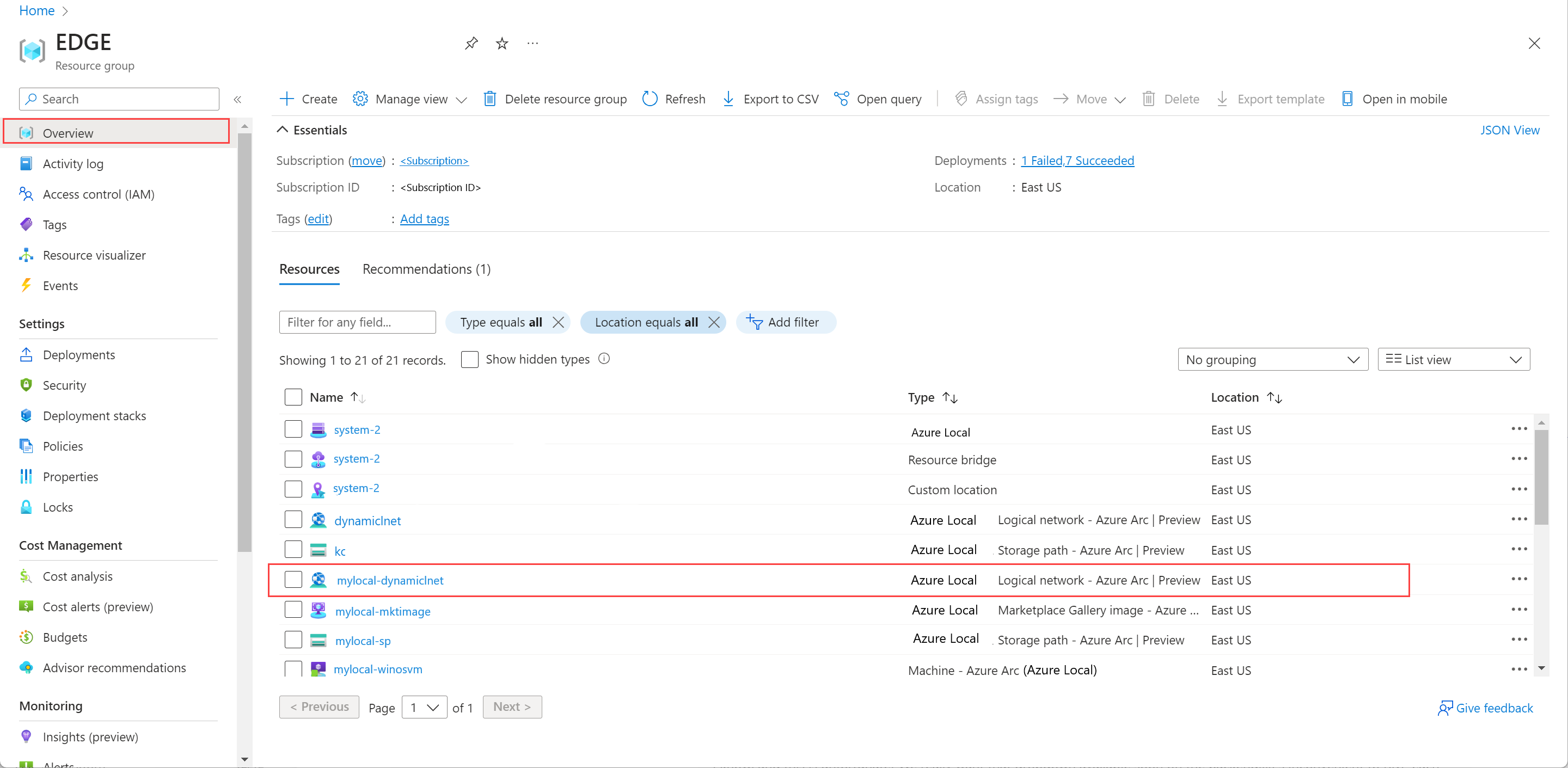 $lnetName = "mylocal-lnet-dhcp" $vSwitchName = "ConvergedSwitch(management_compute_storage)" $subscription = "<subscription-id>" $resourceGroup = "mylocal-rg" $customLocationName = "mylocal-cl" $customLocationID = "/subscriptions/$subscription/resourceGroups/$resourceGroup/providers/Microsoft.ExtendedLocation/customLocations/$customLocationName" $location = "eastus"Note