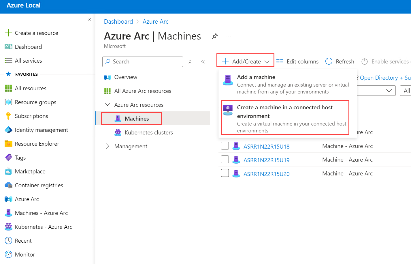 VM creation Create a VM in the portal by selecting Azure Arc > Machines > Add/Create > Create a machine in a connected host environment. For more information, see Create Azure Local VMs with disconnected operations (step 7) and Create Azure Local VMs.