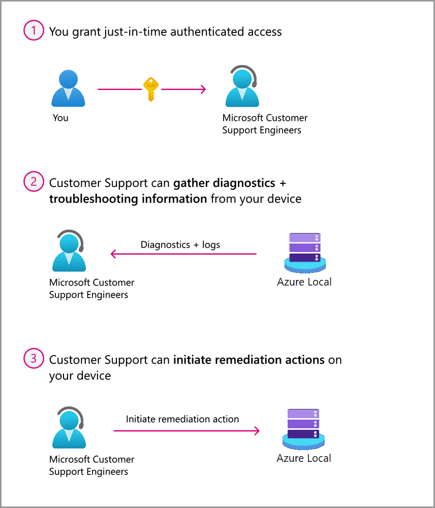 During a remote support session, a Microsoft Support Engineer may need to collect logs. By enabling remote support, you have agreed to a diagnostics log collection by a Microsoft Support Engineer to address a support case. You also acknowledge and consent to the upload and retention of those logs in an Azure storage account managed and controlled by Microsoft. These logs may be accessed by Microsoft in the context of a support case and to improve the health of Azure Local.