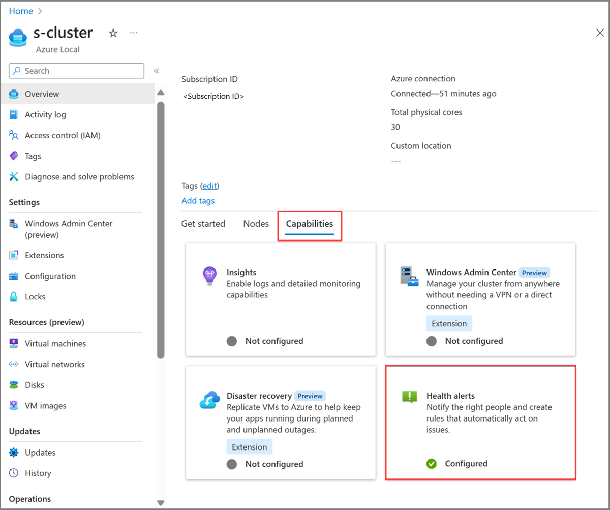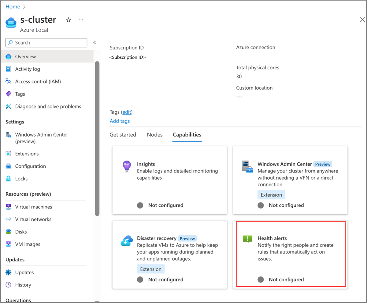 1. Go to your Azure Local system resource page and select your cluster. Under the Capabilities tab, select the Health alerts tile.