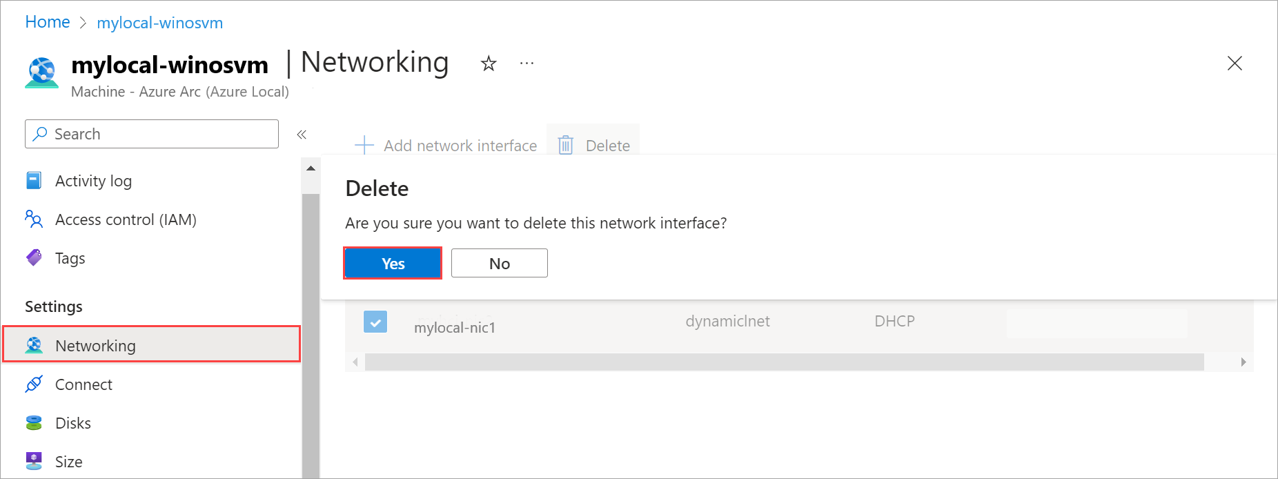 3. Go to Networking and select the network interface that you want to delete. On the command bar, select Delete.