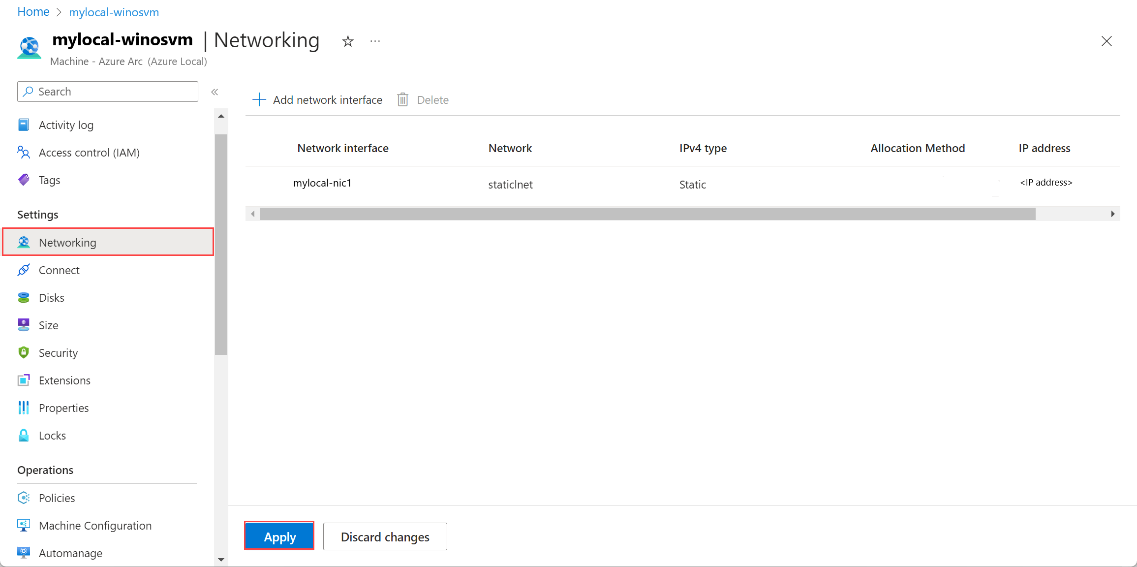5. Select Apply to apply the changes. The network interface is dissociated from the Azure Local VM.