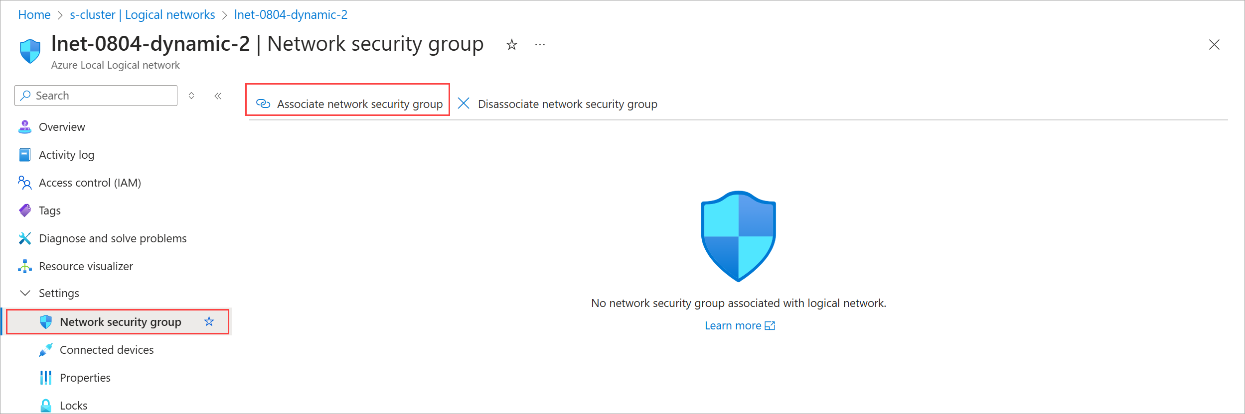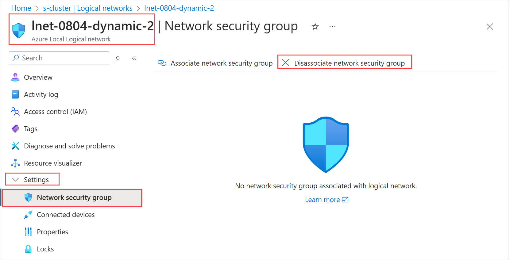 az stack-hci-vm network lnet update -g $resource_group --name $lnetname --network-security-group '""'Expand this section to see an example output.