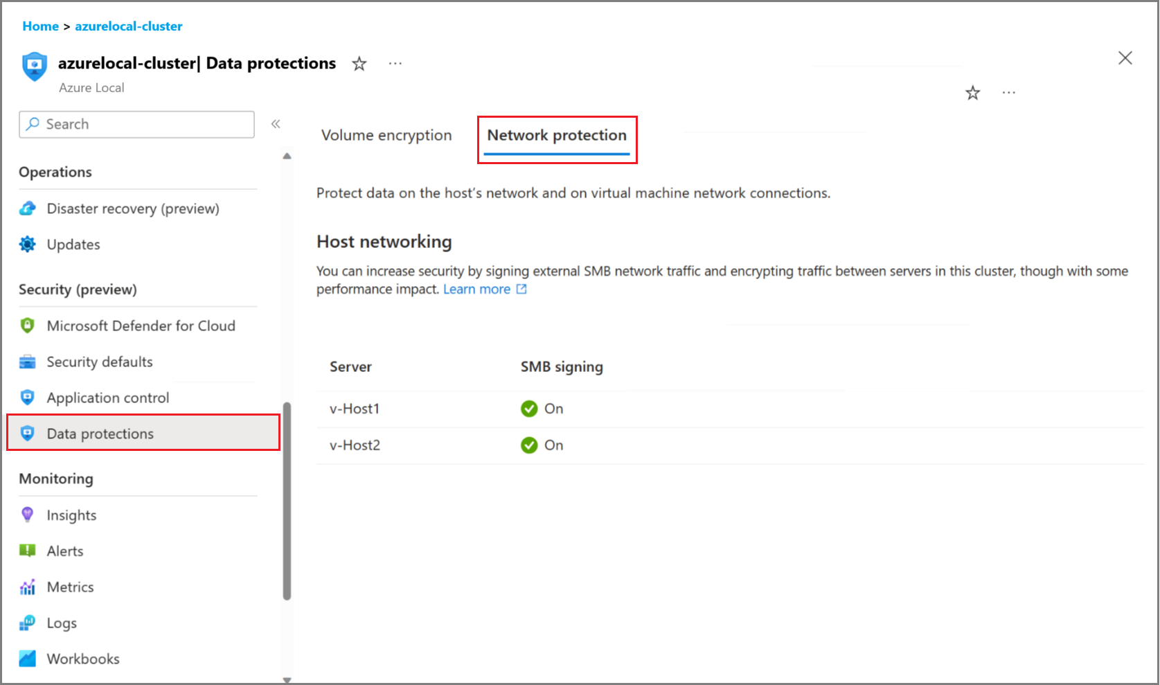 View the SMB signing status under the Data protections > Network protection tab. SMB signing allows you to digitally sign SMB traffic between an Azure Local instance and other systems.
