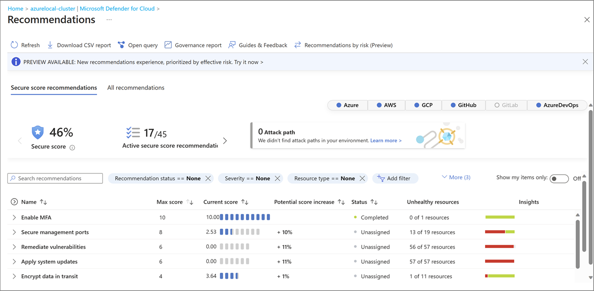 (Optional) To view the security recommendations for multiple Azure Local instances, select the View in Defender for Cloud link. This opens the Recommendations page in the Microsoft Defender for Cloud portal. This page provides security recommendations across all your Azure resources, including Azure Local.
