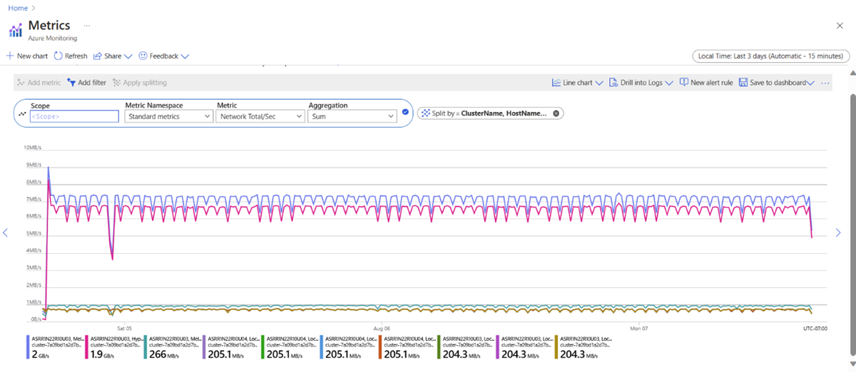 | VM network adapter Network In and Out/Sec | Total rate of data received or sent by the virtual machine across all its virtual network adapters. | Bits Per Second | Maximum | Minimum, Maximum, Average, Sum, Count | Cluster, Node, Virtual Network Adapter |
