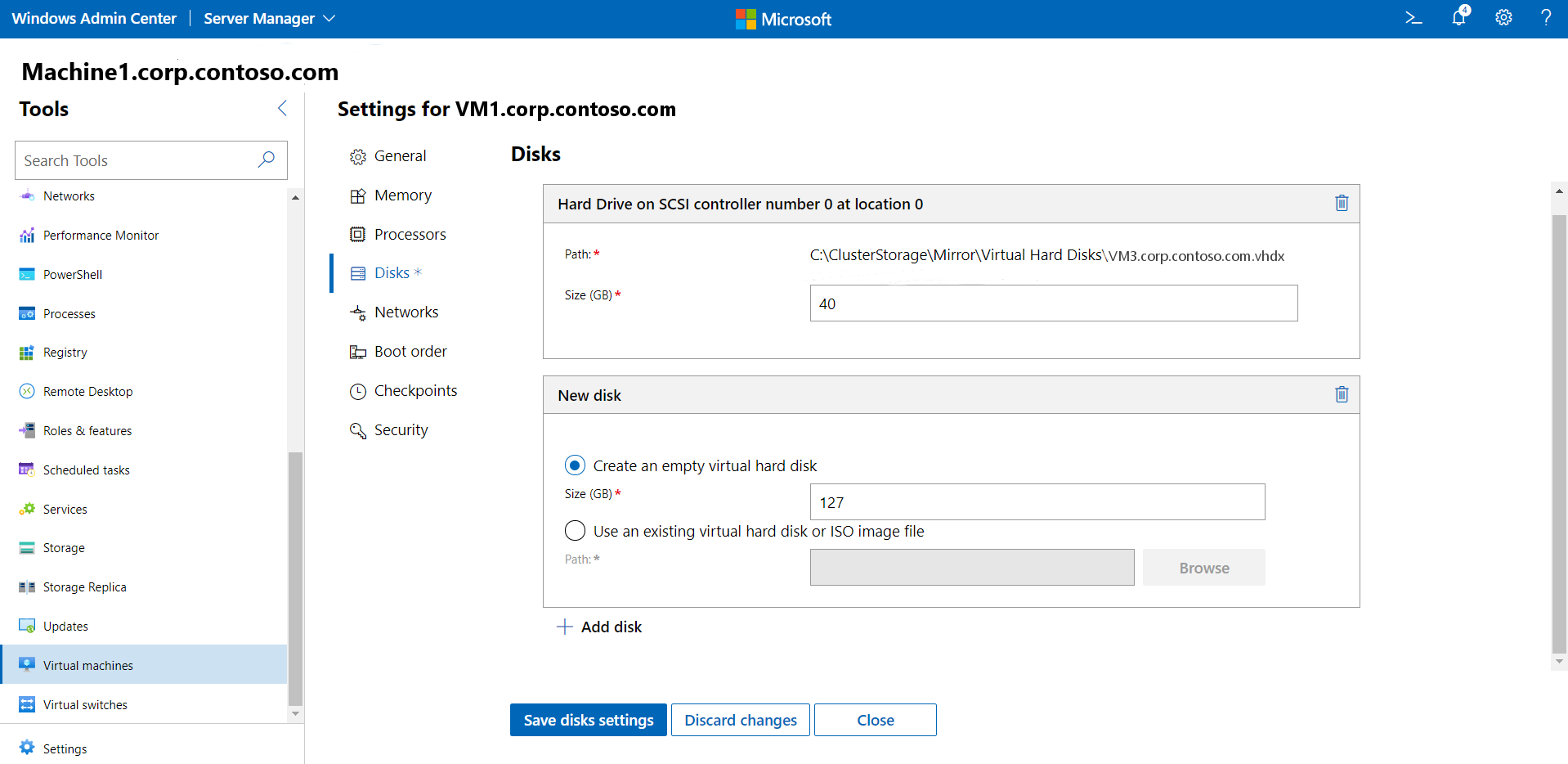 6. To change the size of an existing disk, modify the value in Size (GB). To add a new virtual disk, select Disks and then select whether to create an empty virtual disk or to use an existing virtual disk or ISO (.iso) image file. Select Browse and select the path to the virtual disk or image file.