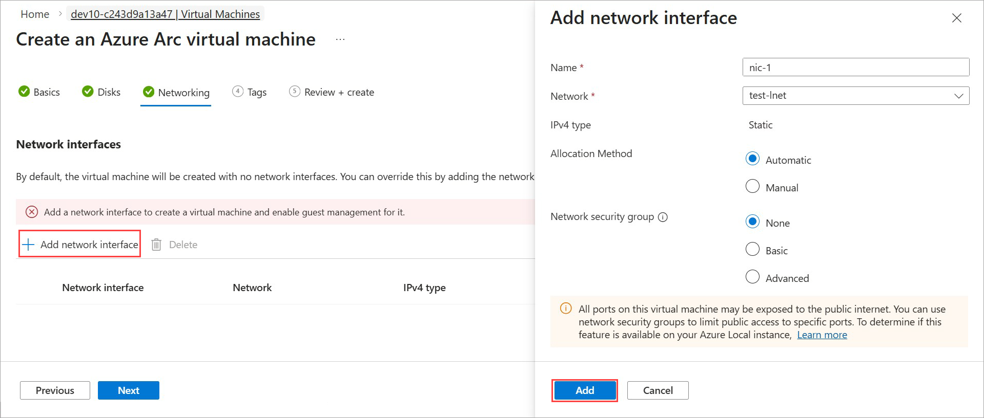 If you need more than one network interface for your VM, create one or more interfaces now before you create the VM. Adding a network interface after the VM is provisioned isn't supported in the preview version.