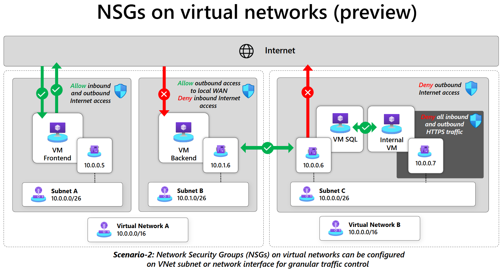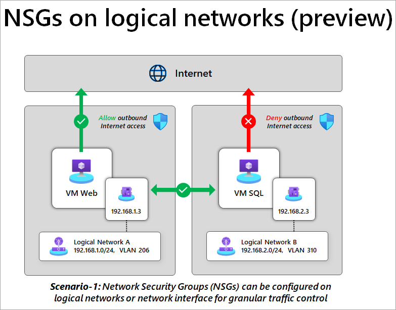 In this example, the NSG controls traffic flow between logical networks A and B, and between VM Web and VM SQL.