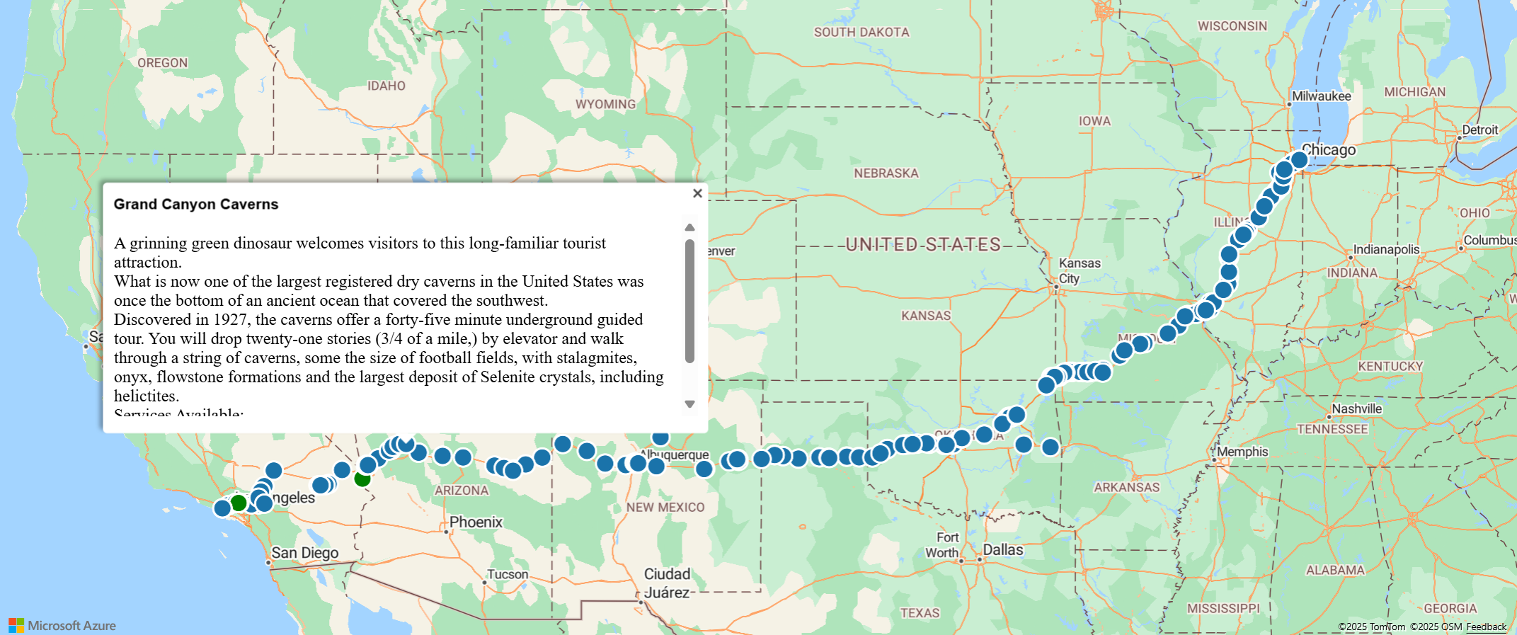 <!DOCTYPE html> <html> <head> <title>Spatial IO Module Example</title> <meta charset="utf-8"> <!-- Ensure that Internet Explorer and Edge use the latest version and don't emulate an older version. --> <meta http-equiv="x-ua-compatible" content="IE=Edge"> <!-- Ensure that the web page looks good on all screen sizes. --> <meta name="viewport" content="width=device-width, initial-scale=1, shrink-to-fit=no"> <!-- Add references to the Azure Maps map control JavaScript and CSS files. --> <link rel="stylesheet" href="https://atlas.microsoft.com/sdk/javascript/mapcontrol/3/atlas.min.css" type="text/css" /> <script src="https://atlas.microsoft.com/sdk/javascript/mapcontrol/3/atlas.js"></script> <!-- Add reference to the Azure Maps Spatial IO module. --> <script src="https://atlas.microsoft.com/sdk/javascript/spatial/0/atlas-spatial.js"></script> <script type='text/javascript'> var map, datasource, layer; function GetMap() { //Initialize a map instance. map = new atlas.Map('myMap', { view: 'Auto', //Add your Azure Maps subscription key to the map SDK. Get an Azure Maps key at https://azure.com/maps. authOptions: { authType: 'subscriptionKey', subscriptionKey: '<Your Azure Maps Key>' } }); //Wait until the map resources are ready. map.events.add('ready', function() { //Create a data source and add it to the map. datasource = new atlas.source.DataSource(); map.sources.add(datasource); //Add a simple data layer for rendering the data. layer = new atlas.layer.SimpleDataLayer(datasource); map.layers.add(layer); //Read an XML file from a URL or pass in a raw XML string. atlas.io.read('Route66Attractions.xml').then(r => { if (r) { //Add the feature data to the data source. datasource.add(r); //If bounding box information is known for data, set the map view to it. if (r.bbox) { map.setCamera({ bounds: r.bbox, padding: 50 }); } } }); }); } </script> </head> <body onload='GetMap()'> <div id="myMap" style="position:relative;width:100%;min-width:290px;height:600px;"></div> </body> </html>Remember to replace