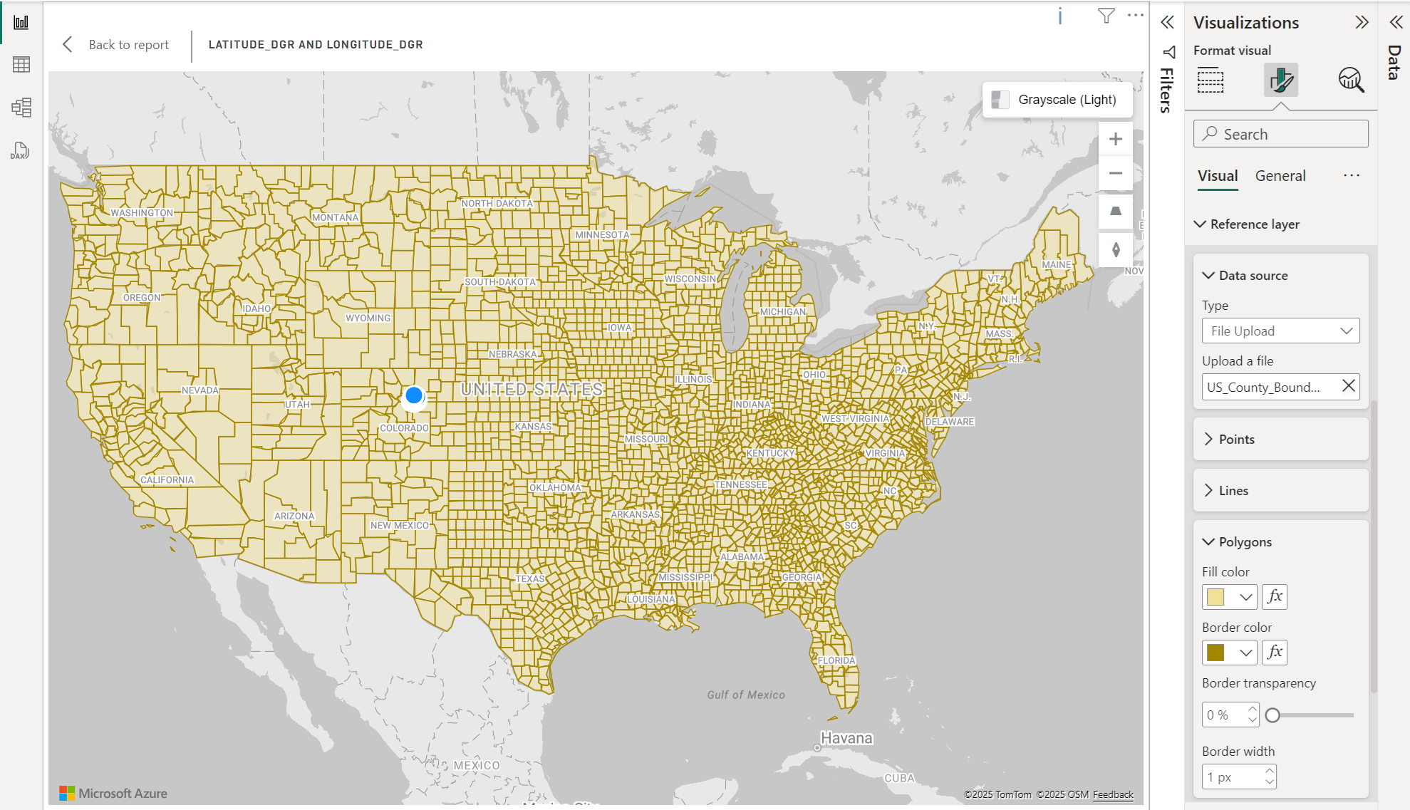 The Custom style for reference layer via format pane feature in Azure Maps enables you to personalize the appearance of reference layers. You can define the color, border width, and transparency of points, lines, and polygons directly in the Azure Maps Power BI visual interface, to enhance the visual clarity and impact of your geospatial data.