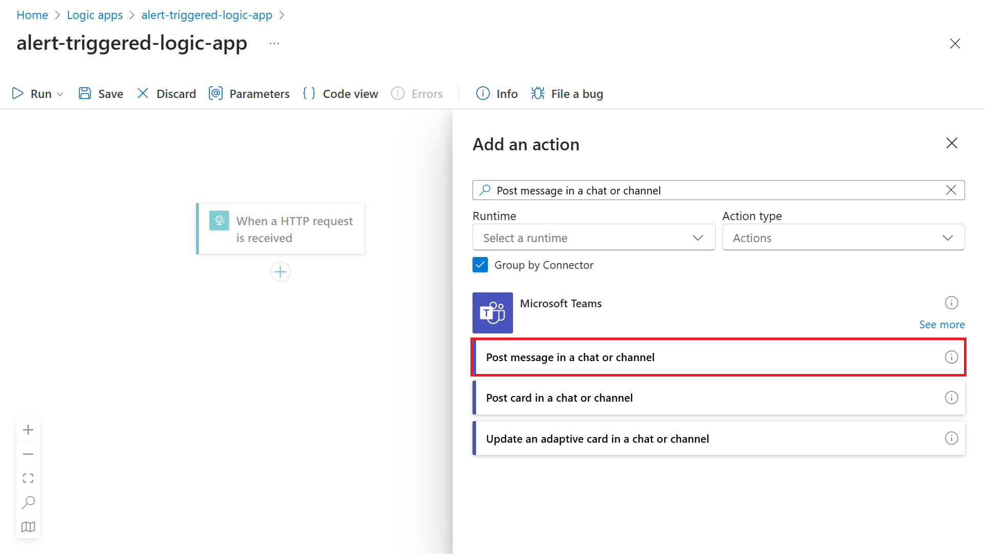 Integrate with external services by using existing connectors like Outlook, Microsoft Teams, Slack, and PagerDuty. You can also configure the logic app for your own services.