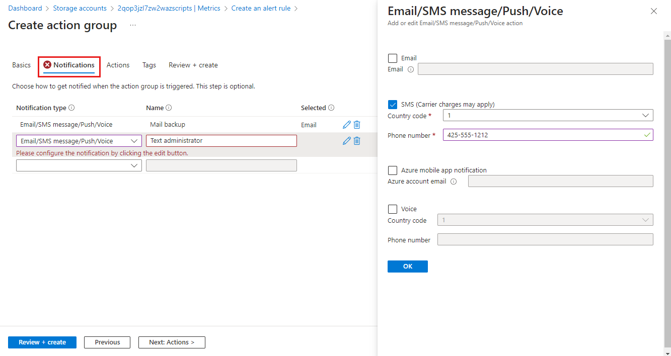 Select a Subscription and Resource group for the action group and give it an Action group name that will appear in the portal and a Display name that will appear in email and SMS notifications.