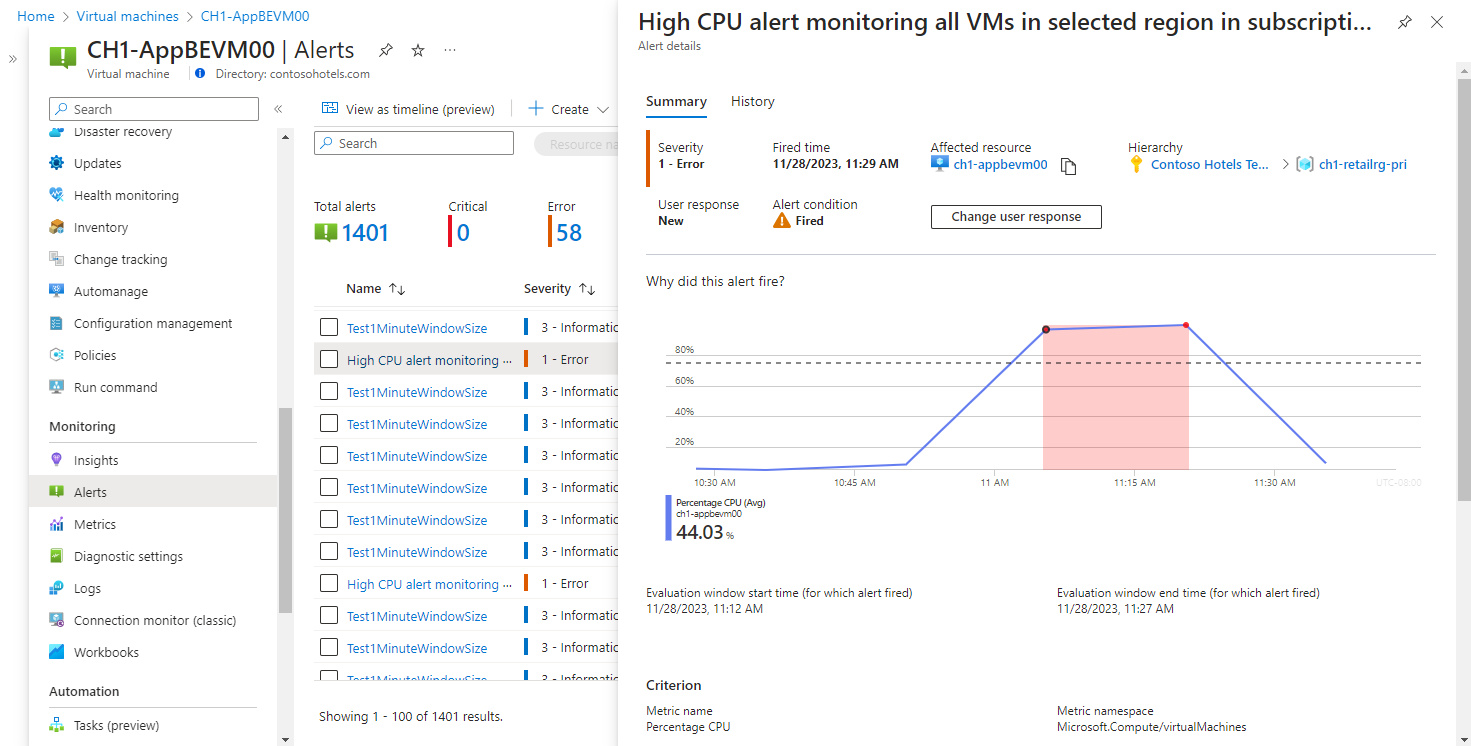 Azure Monitor alerts proactively notify you when important conditions are found in your monitoring data. Metric alert rules create an alert when a metric value from an Azure resource exceeds a threshold.