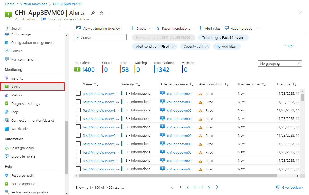 Select Alerts from the resource's menu. If there are any open alerts for the resources, they are included in the view.