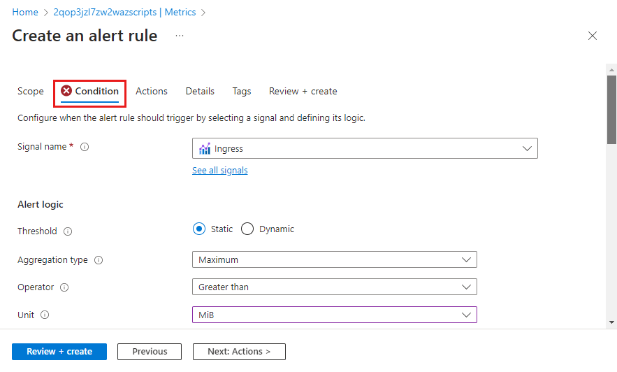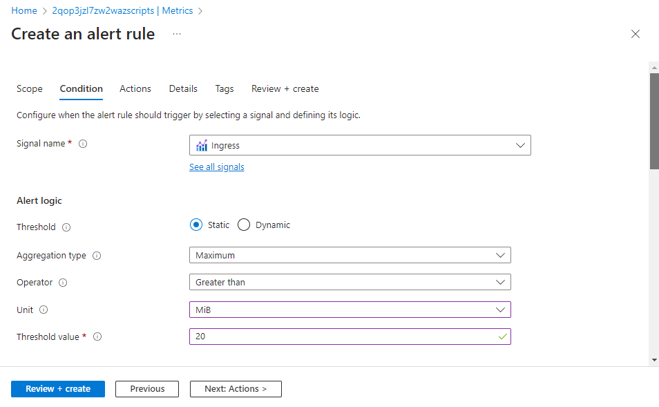 Click Review + create and then Create to create the alert rule.