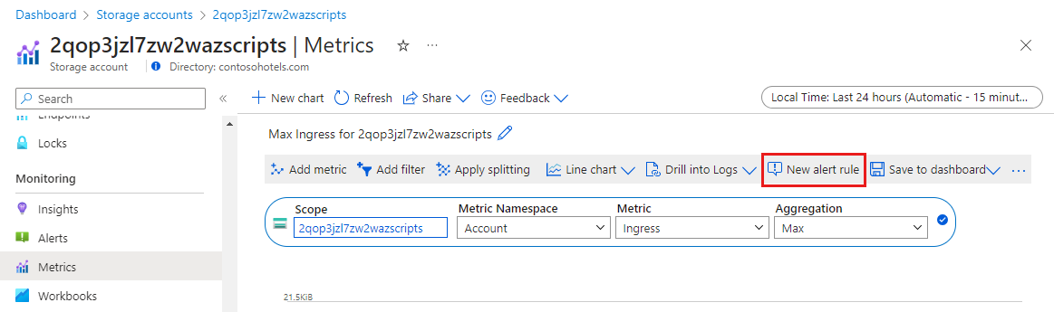 From metrics explorer, click New alert rule. The rule will be preconfigured with the target object and the metric that you selected in metrics explorer.