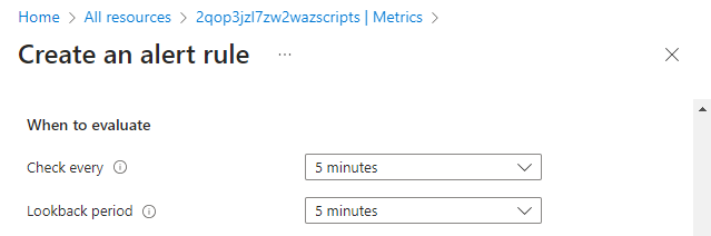 You can accept the default time granularity or modify it to your requirements. Check every defines how often the alert rule will check if the condition is met. Lookback period defines the time interval over which the collected values are aggregated. For example, every 5 minutes, you'll be looking at the past 5 minutes.